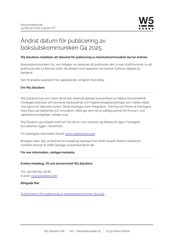 W5 Solutions meddelar att datumet för publicering av bokslutskommunikén Q4 har ändrats.