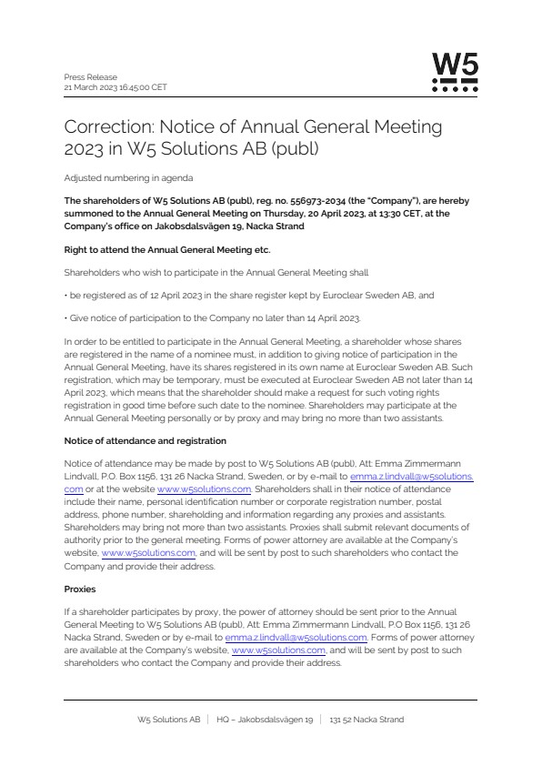The shareholders of W5 Solutions AB (publ), reg. no. 556973-2034 (the “Company”), are hereby summoned to the Annual General Meeting on Thursday, 20 April 2023, at 13:30 CET, at the Company’s office on Jakobsdalsvägen 19, Nacka Strand