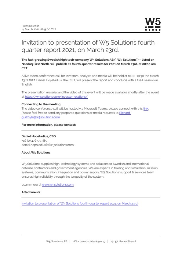 The fast-growing Swedish high tech-company W5 Solutions AB (” W5 Solutions”) – listed on Nasdaq First North, will publish its fourth-quarter results for 2021 on March 23rd, at 08:00 am CET.