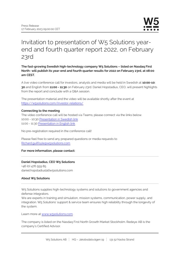 The fast-growing Swedish high-technology company W5 Solutions – listed on Nasdaq First North- will publish its year-end and fourth quarter results for 2022 on February 23rd, at 08:00 am CEST.