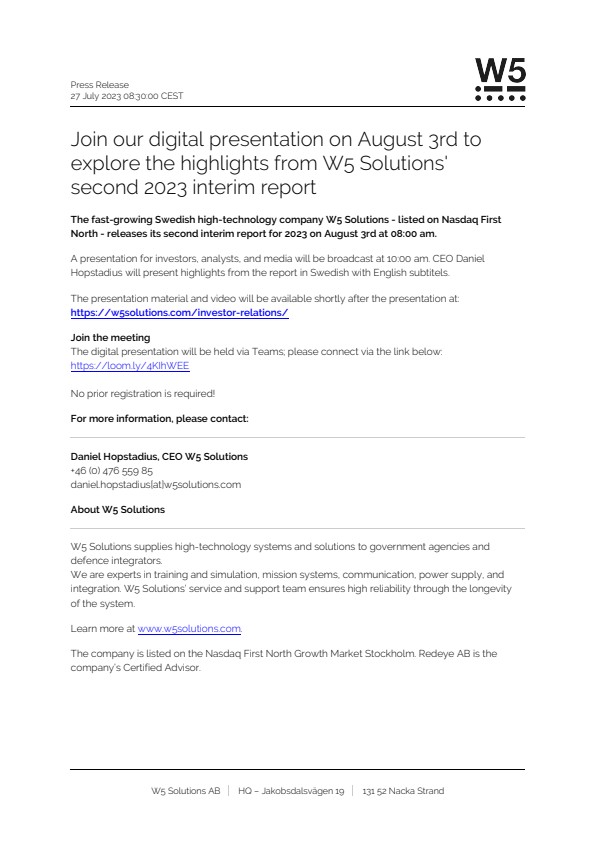 The fast-growing Swedish high-technology company W5 Solutions – listed on Nasdaq First North – releases its second interim report for 2023 on August 3rd at 08:00 am.