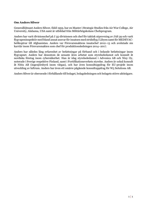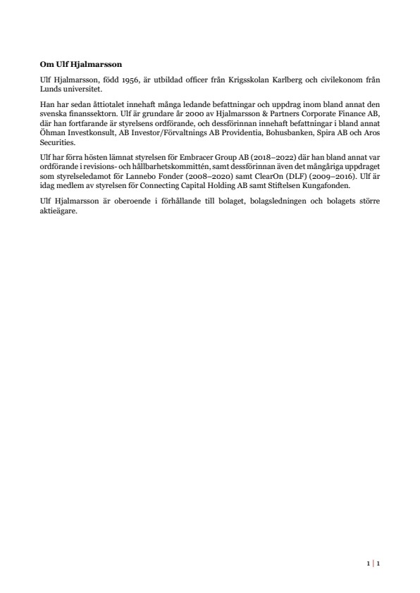Det beslutades att styrelsen ska bestå av fem ledamöter. Årsstämman beslutade om omval av Anders Lundström och Jonas Rydin samt nyval av Anders Silwer, Ulf Hjalmarsson och Erik Heilborn, till styrelseledamöter för tiden intill slutet av nästa årsstämma. Presentation av nyvalda ledamöter finns presenterade i bifogade filer och på Bolagets hemsida.