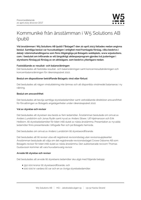 Vid årsstämman i W5 Solutions AB (publ) (”Bolaget”) den 20 april 2023 fattades nedan angivna beslut. Samtliga beslut var huvudsakligen i enlighet med framlagda förslag, vilka beskrivs i detalj i stämmohandlingarna som finns tillgängliga på Bolagets webbplats, www.w5solutions.com. I beslutet om införande av ett långsiktigt aktiesparprogram gjordes två justeringar i styrelsens förslag på förslag av en aktieägare, som beskrivs ytterligare nedan.