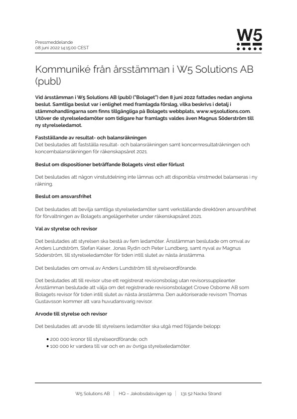 Vid årsstämman i W5 Solutions AB (publ) (”Bolaget”) den 8 juni 2022 fattades nedan angivna beslut. Samtliga beslut var i enlighet med framlagda förslag, vilka beskrivs i detalj i stämmohandlingarna som finns tillgängliga på Bolagets webbplats, www.w5solutions.com. Utöver de styrelseledamöter som tidigare har framlagts valdes även Magnus Söderström till ny styrelseledamot.