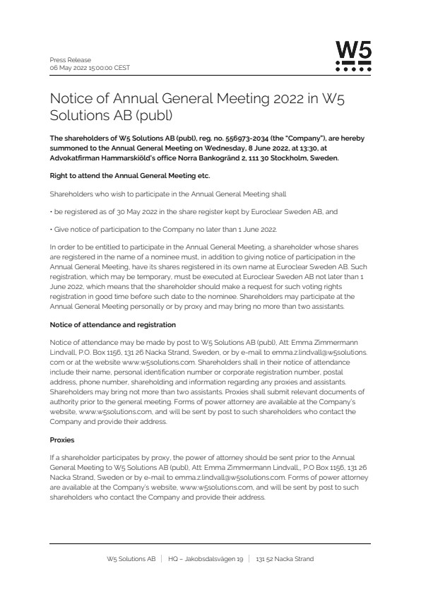 The shareholders of W5 Solutions AB (publ), reg. no. 556973-2034 (the “Company”), are hereby summoned to the Annual General Meeting on Wednesday, 8 June 2022, at 13:30, at Advokatfirman Hammarskiöld’s office Norra Bankogränd 2, 111 30 Stockholm, Sweden.