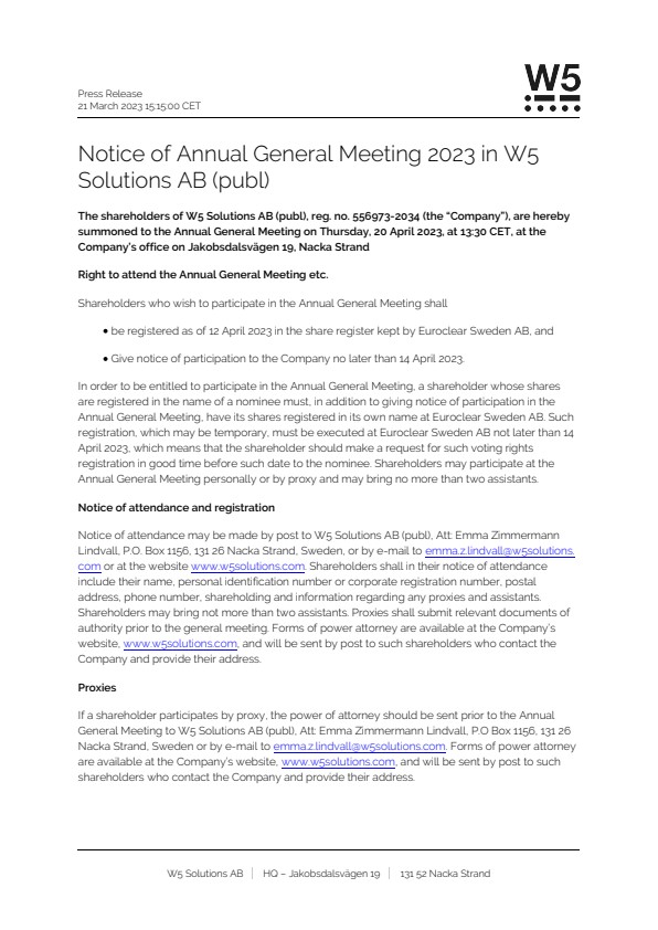 The shareholders of W5 Solutions AB (publ), reg. no. 556973-2034 (the “Company”), are hereby summoned to the Annual General Meeting on Thursday, 20 April 2023, at 13:30 CET, at the Company’s office on Jakobsdalsvägen 19, Nacka Strand