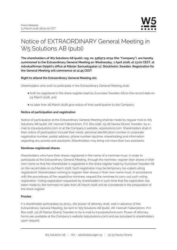The shareholders of W5 Solutions AB (publ), reg. no. 556973-2034 (the “Company”), are hereby summoned to the Extraordinary General Meeting on Wednesday, 1 April 2026, at 13:00 CEST, at Advokatfirman Delphi’s office at Mäster Samuelsgatan 17, Stockholm, Sweden. Registration for the General Meeting will commence at 12:45 CEST.