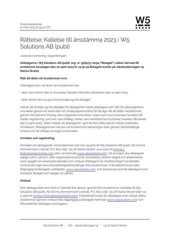 Aktieägarna i W5 Solutions AB (publ), org. nr. 556973–2034 (”Bolaget”), kallas härmed till årsstämma torsdagen den 20 april 2023 kl. 13.30 på Bolagets kontor på Jakobsdalsvägen 19, Nacka Strand.