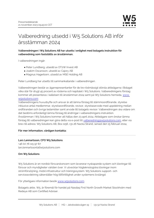 Valberedningen består av ägarrepresentanter för de tre röstmässigt största aktieägarna i Bolaget vilka står för drygt 45 procent av rösterna och kapitalet i W5 Solutions. Valberedningens förslag kommer att presenteras i kallelsen till årsstämman 2024 samt på W5 Solutions hemsida, www.w5solutions.com