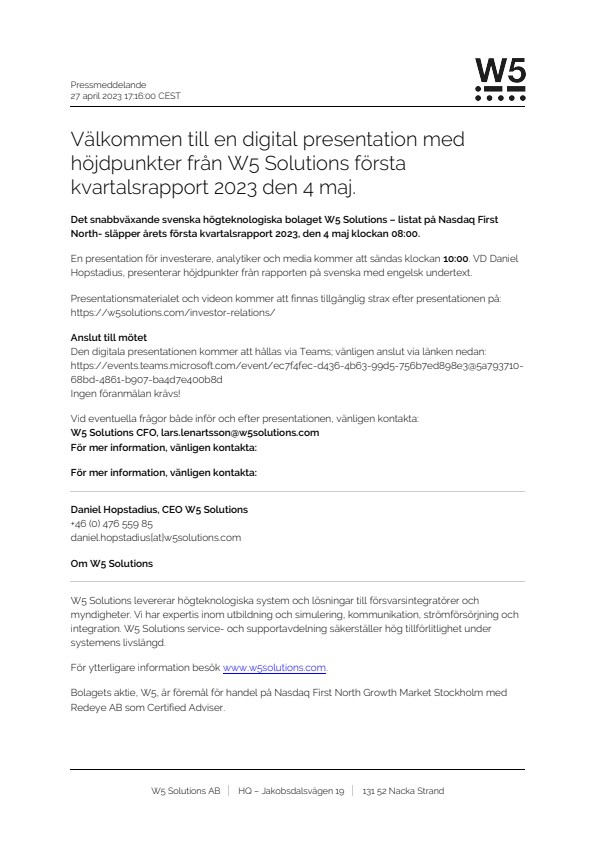 Presentationsmaterialet och videon kommer att finnas tillgänglig strax efter presentationen på: https://w5solutions.com/investor-relations/