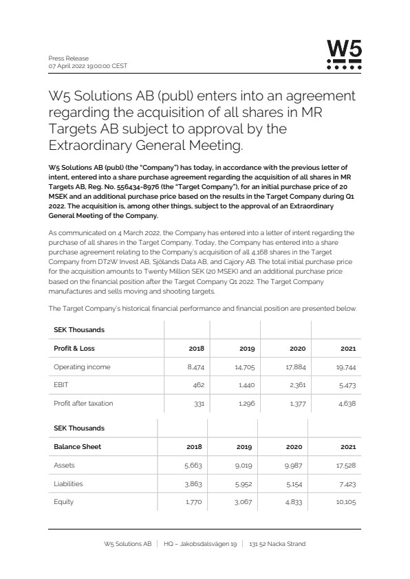 W5 Solutions AB (publ) (the “Company”) has today, in accordance with the previous letter of intent, entered into a share purchase agreement regarding the acquisition of all shares in MR Targets AB, Reg. No. 556434-8976 (the “Target Company”), for an initial purchase price of 20 MSEK and an additional purchase price based on the results in the Target Company during Q1 2022. The acquisition is, among other things, subject to the approval of an Extraordinary General Meeting of the Company.