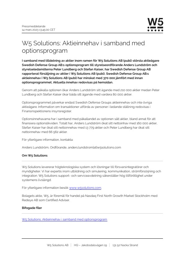 I samband med tilldelning av aktier inom ramen för W5 Solutions AB (publ) största aktieägare Swedish Defense Group AB:s optionsprogram till styrelseordförande Anders Lundström och styrelseledamöterna Peter Lundberg och Stefan Kaiser, har Swedish Defense Group AB rapporterat försäljning av aktier i W5 Solutions AB (publ). Swedish Defense Group AB:s aktieinnehav i W5 Solutions AB (publ) har minskat med 370 000 jämfört med innan optionsprogrammet. Aktuella innehav redovisas på hemsidan.