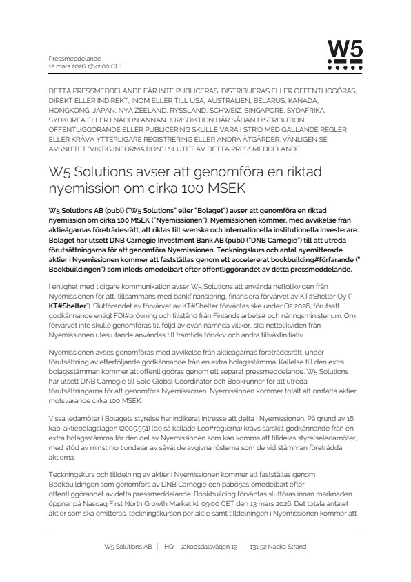 W5 Solutions AB (publ) (”W5 Solutions” eller ”Bolaget”) avser att genomföra en riktad nyemission om cirka 100 MSEK (”Nyemissionen”). Nyemissionen kommer, med avvikelse från aktieägarnas företrädesrätt, att riktas till svenska och internationella institutionella investerare. Bolaget har utsett DNB Carnegie Investment Bank AB (publ) (”DNB Carnegie”) till att utreda förutsättningarna för att genomföra Nyemissionen. Teckningskurs och antal nyemitterade aktier i Nyemissionen kommer att fastställas genom ett accelererat bookbuilding‑förfarande (”Bookbuildingen”) som inleds omedelbart efter offentliggörandet av detta pressmeddelande.