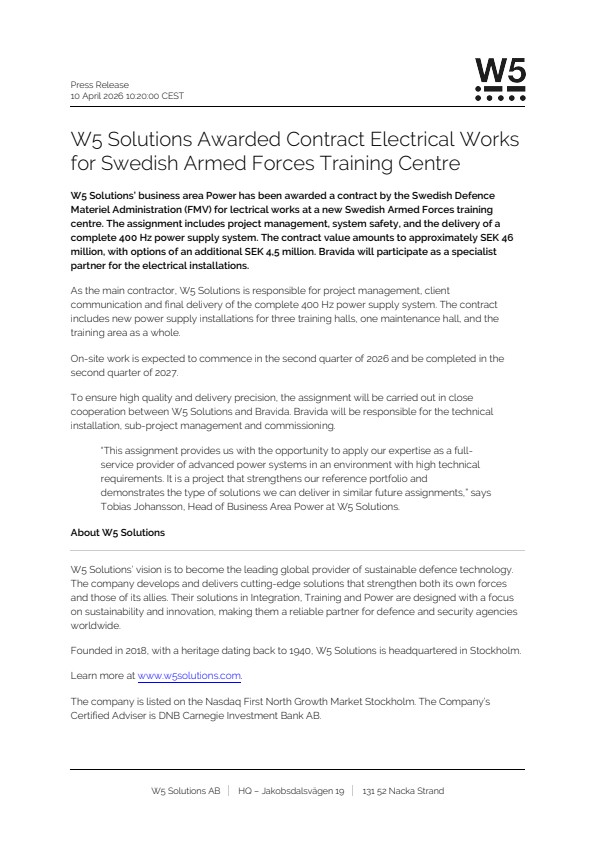 W5 Solutions’ business area Power has been awarded a contract by the Swedish Defence Materiel Administration (FMV) for lectrical works at a new Swedish Armed Forces training centre. The assignment includes project management, system safety, and the delivery of a complete 400 Hz power supply system. The contract value amounts to approximately SEK 46 million, with options of an additional SEK 4,5 million. Bravida will participate as a specialist partner for the electrical installations.