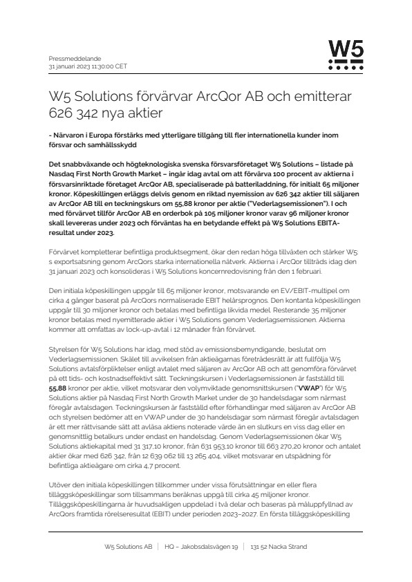 Det snabbväxande och högteknologiska svenska försvarsföretaget W5 Solutions – listade på Nasdaq First North Growth Market – ingår idag avtal om att förvärva 100 procent av aktierna i försvarsinriktade företaget ArcQor AB, specialiserade på batteriladdning, för initialt 65 miljoner kronor. Köpeskillingen erläggs delvis genom en riktad nyemission av 626 342 aktier till säljaren av ArcQor AB till en teckningskurs om 55,88 kronor per aktie (”Vederlagsemissionen”). I och med förvärvet tillför ArcQor AB en orderbok på 105 miljoner kronor varav 96 miljoner kronor skall levereras under 2023 och förväntas ha en betydande effekt på W5 Solutions EBITA-resultat under 2023.