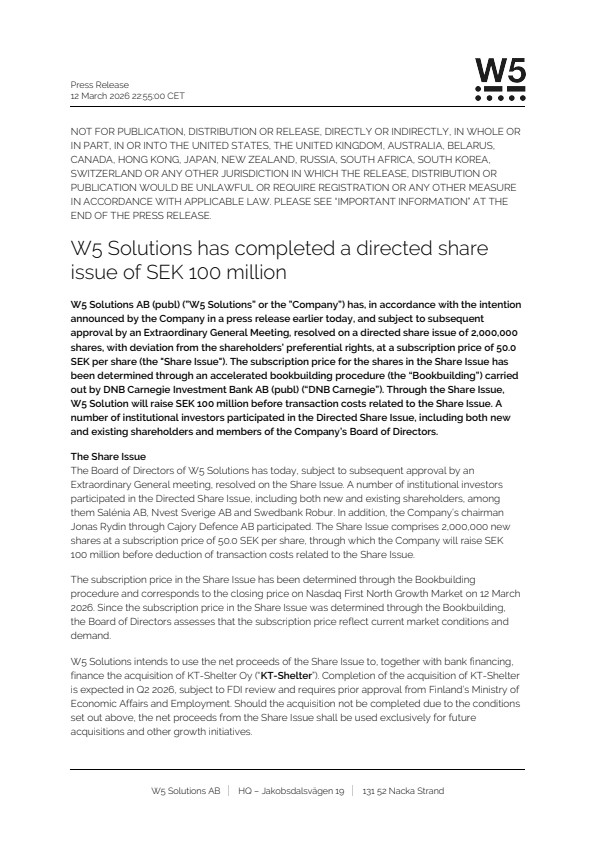 W5 Solutions intends to use the net proceeds of the Share Issue to, together with bank financing, finance the acquisition of KT-Shelter Oy (“KT-Shelter”). Completion of the acquisition of KT-Shelter is expected in Q2 2026, subject to FDI review and requires prior approval from Finland’s Ministry of Economic Affairs and Employment. Should the acquisition not be completed due to the conditions set out above, the net proceeds from the Share Issue shall be used exclusively for future acquisitions and other growth initiatives.