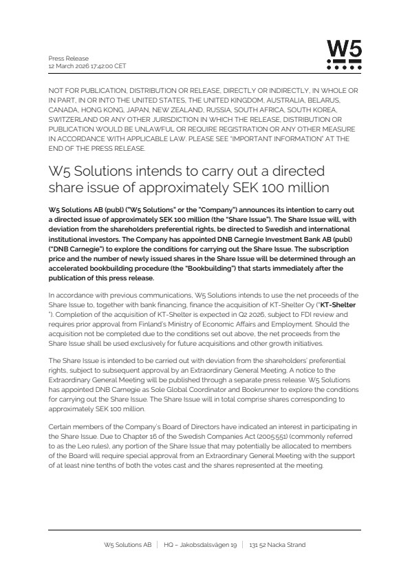 W5 Solutions AB (publ) (”W5 Solutions” or the ”Company”) announces its intention to carry out a directed issue of approximately SEK 100 million (the “Share Issue”). The Share Issue will, with deviation from the shareholders preferential rights, be directed to Swedish and international institutional investors. The Company has appointed DNB Carnegie Investment Bank AB (publ) (“DNB Carnegie”) to explore the conditions for carrying out the Share Issue. The subscription price and the number of newly issued shares in the Share Issue will be determined through an accelerated bookbuilding procedure (the “Bookbuilding”) that starts immediately after the publication of this press release.