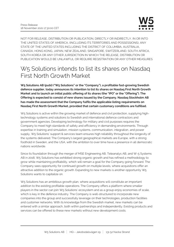 W5 Solutions AB (publ) (“W5 Solutions” or the “Company”), a profitable fast-growing Swedish defence supplier, today announces its intention to list its shares on Nasdaq First North Growth Market and to launch an initial public offering of its shares (the “IPO” or the “Offering”). The Offering is expected to consist of new shares issued by the Company. Nasdaq Stockholm AB has made the assessment that the Company fulfils the applicable listing requirements on Nasdaq First North Growth Market, provided that certain customary conditions are fulfilled.