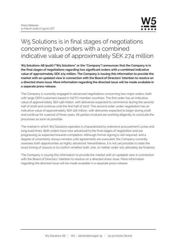 W5 Solutions AB (publ) (“W5 Solutions” or the “Company”) announces that the Company is in the final stages of negotiations regarding two significant orders with a combined indicative value of approximately SEK 274 million. The Company is issuing this information to provide the market with an updated view in connection with the Board of Directors’ intention to resolve on a directed share issue. More information regarding the directed issue will be made available in a separate press release.