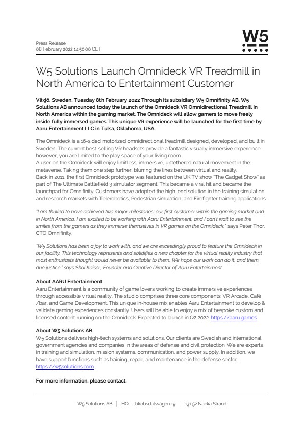 Växjö, Sweden, Tuesday 8th February 2022 Through its subsidiary W5 Omnifinity AB, W5 Solutions AB announced today the launch of the Omnideck VR Omnidirectional Treadmill in North America within the gaming market. The Omnideck will allow gamers to move freely inside fully immersed games. This unique VR experience will be launched for the first time by Aaru Entertainment LLC in Tulsa, Oklahoma, USA.