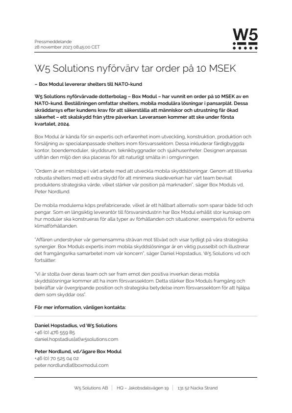 W5 Solutions nyförvärvade dotterbolag – Box Modul – har vunnit en order på 10 MSEK av en NATO-kund. Beställningen omfattar shelters, mobila modulära lösningar i pansarplåt. Dessa skräddarsys efter kundens krav för att säkerställa att människor och utrustning får ökad säkerhet – ett skalskydd från yttre påverkan. Leveransen kommer att ske under första kvartalet, 2024.