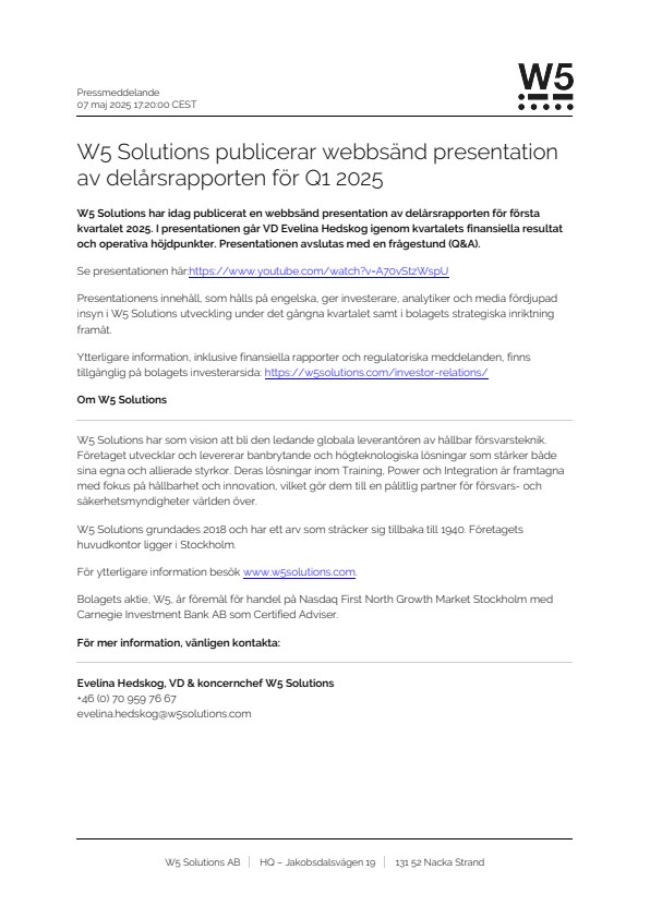 Ytterligare information, inklusive finansiella rapporter och regulatoriska meddelanden, finns tillgänglig på bolagets investerarsida: https://w5solutions.com/investor-relations/