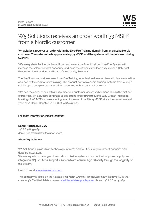 W5 Solutions receives an order within the Live-Fire Training domain from an existing Nordic customer. The order value is approximately 33 MSEK, and the systems will be delivered during Q4 2022.