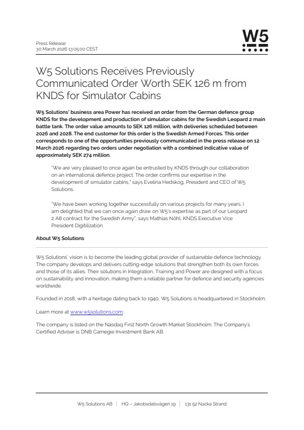 W5 Solutions’ business area Power has received an order from the German defence group KNDS for the development and production of simulator cabins for the Swedish Leopard 2 main battle tank. The order value amounts to SEK 126 million, with deliveries scheduled between 2026 and 2028. The end customer for this order is the Swedish Armed Forces. This order corresponds to one of the opportunities previously communicated in the press release on 12 March 2026 regarding two orders under negotiation with a combined indicative value of approximately SEK 274 million.