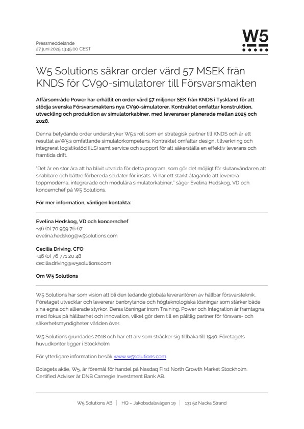 Denna betydande order understryker W5:s roll som en strategisk partner till KNDS och är ett resultat avW5:s omfattande simulatorkompetens. Kontraktet omfattar design, tillverkning och integrerat logistikstöd (ILS) samt service och support för att säkerställa en effektiv leverans och framtida drift.