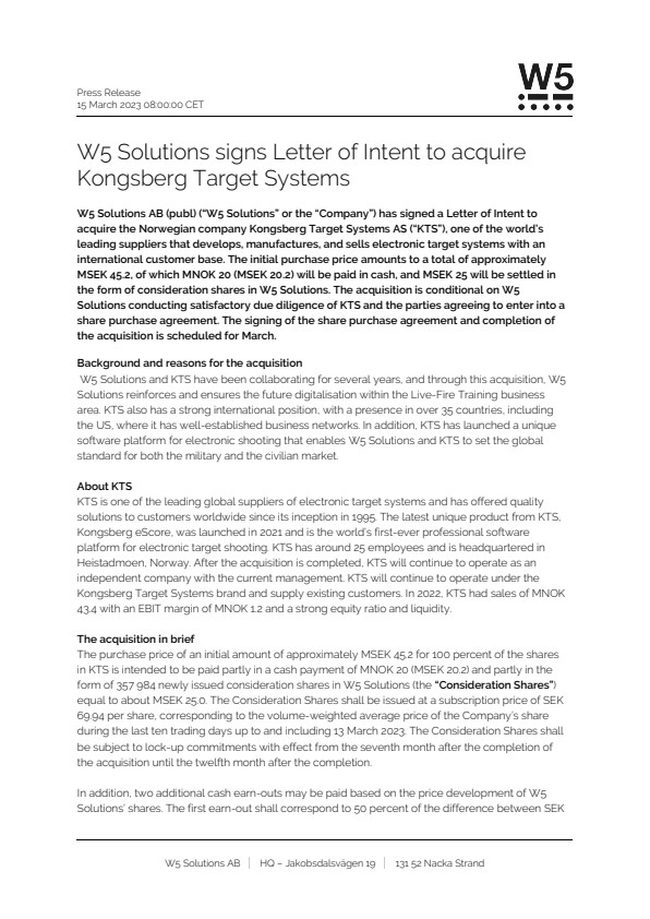 W5 Solutions AB (publ) (“W5 Solutions” or the “Company”) has signed a Letter of Intent to acquire the Norwegian company Kongsberg Target Systems AS (“KTS”), one of the world’s leading suppliers that develops, manufactures, and sells electronic target systems with an international customer base. The initial purchase price amounts to a total of approximately MSEK 45.2, of which MNOK 20 (MSEK 20.2) will be paid in cash, and MSEK 25 will be settled in the form of consideration shares in W5 Solutions. The acquisition is conditional on W5 Solutions conducting satisfactory due diligence of KTS and the parties agreeing to enter into a share purchase agreement. The signing of the share purchase agreement and completion of the acquisition is scheduled for March.