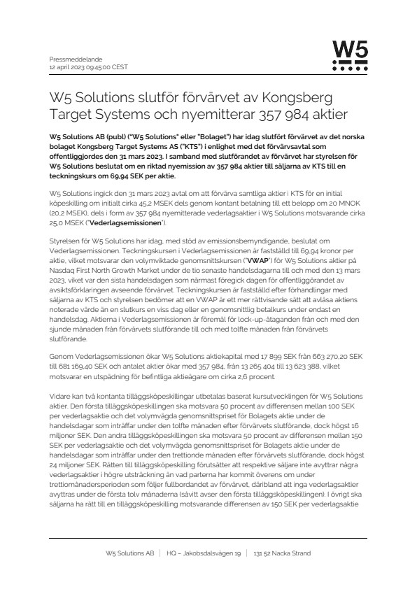 W5 Solutions AB (publ) (“W5 Solutions" eller ”Bolaget”) har idag slutfört förvärvet av det norska bolaget Kongsberg Target Systems AS (”KTS”) i enlighet med det förvärvsavtal som offentliggjordes den 31 mars 2023. I samband med slutförandet av förvärvet har styrelsen för W5 Solutions beslutat om en riktad nyemission av 357 984 aktier till säljarna av KTS till en teckningskurs om 69,94 SEK per aktie.