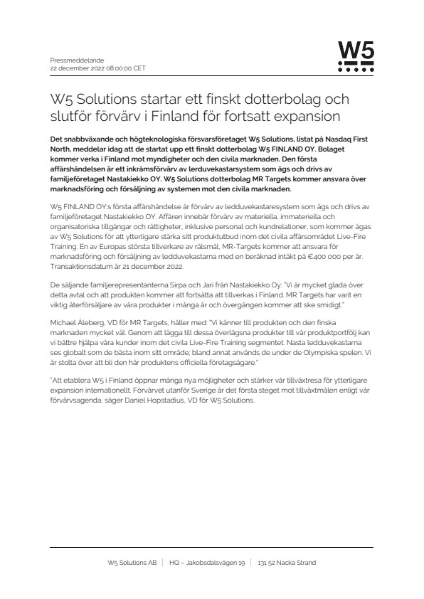 W5 FINLAND Oy:s första affärshändelse är förvärv av lerduvekastaresystem som ägs och drivs av familjeföretaget Nastakiekko Oy. Affären innebär förvärv av materiella, immateriella och organisatoriska tillgångar och rättigheter, inklusive personal och kundrelationer, som kommer ägas av W5 Solutions för att ytterligare stärka sitt produktutbud inom det civila affärsområdet Live-Fire Training. En av Europas största tillverkare av rälsmål, MR Targets kommer att ansvara för marknadsföring och försäljning av lerduvekastarna med en beräknad intäkt på €400 000 per år. Transaktionsdatum är 21 december 2022.