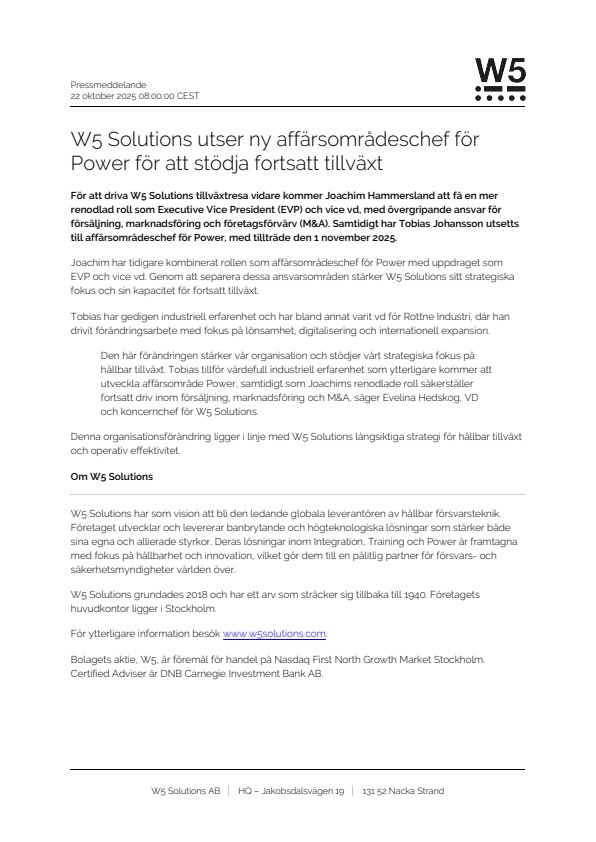För att driva W5 Solutions tillväxtresa vidare kommer Joachim Hammersland att få en mer renodlad roll som Executive Vice President (EVP) och vice vd, med övergripande ansvar för försäljning, marknadsföring och företagsförvärv (M&A). Samtidigt har Tobias Johansson utsetts till affärsområdeschef för Power, med tillträde den 1 november 2025.