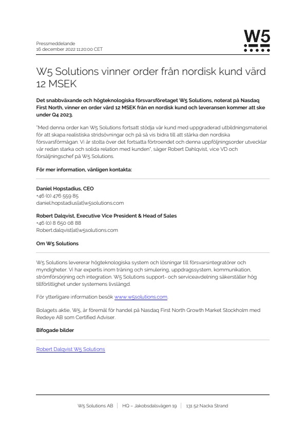 ”Med denna order kan W5 Solutions fortsatt stödja vår kund med uppgraderad utbildningsmateriel för att skapa realistiska stridsövningar och på så vis bidra till att stärka den nordiska försvarsförmågan. Vi är stolta över det fortsatta förtroendet och denna uppföljningsorder utvecklar vår redan starka och solida relation med kunden", säger Robert Dahlqvist, vice VD och försäljningschef på W5 Solutions.