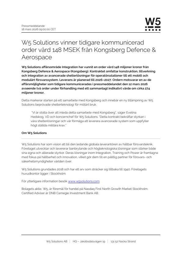 W5 Solutions affärsområde Integration har vunnit en order värd 148 miljoner kronor från Kongsberg Defence & Aerospace (Kongsberg). Kontraktet omfattar konstruktion, tillverkning och integration av avancerade shelterlösningar för operatörsstationer till ett mobilt och modulärt försvarssystem. Leverans är planerad till 2026–2027. Ordern motsvarar en av de affärsmöjligheter som tidigare kommunicerades i pressmeddelandet den 12 mars 2026 avseende två order under förhandling med ett sammanlagt indikativt värde om cirka 274 miljoner kronor.