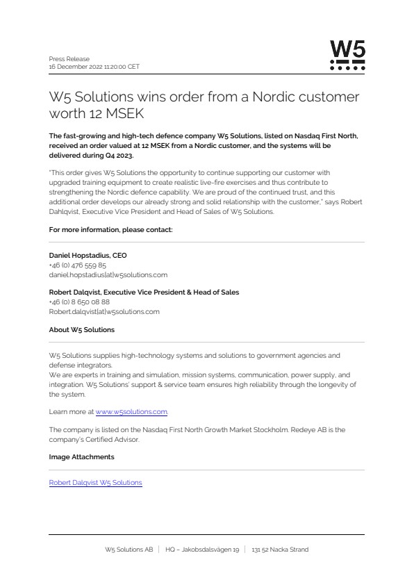 The fast-growing and high-tech defence company W5 Solutions, listed on Nasdaq First North, received an order valued at 12 MSEK from a Nordic customer, and the systems will be delivered during Q4 2023.